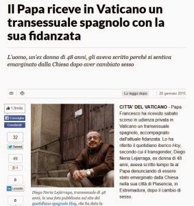 The transexual wants, with the girlfriend presented to the Pope - always by his own admission - to "start a family". He claims the Pope said that "he was pleased". La Repubblica therefore headlined yesterday: "Pope Francis receives Spanish Transsexual in the Vatican with His Fiancée."